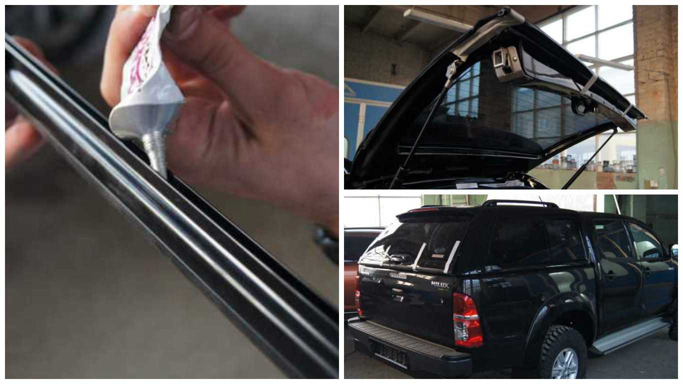 С помощью двухкомпонентного молекулярного клея или термоклея приклеить на крышку кунга пыльник и зафиксировать его на малярный скотч, который можно удалить после нескольких дней эксплуатации.