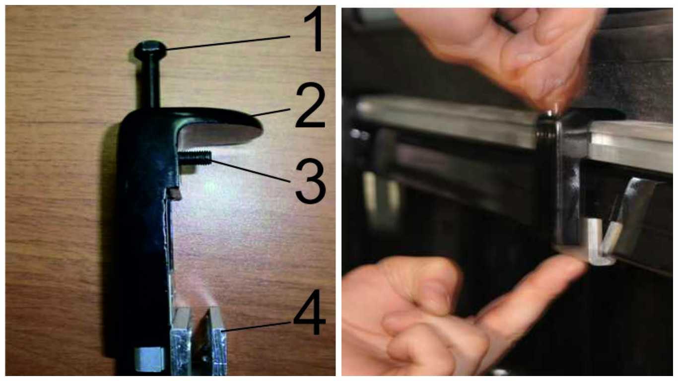 Установить крепежные струбцины, которые обычно распределяются по бортам равномерно. Для чего ослабить болт (1), прикрепить струбцину (2) на крепежную направляющую и зафиксировать ее болтами (3) к закладным. Нижнюю часть струбцины (4) надеть на нижнюю часть кромки борта и зафиксировать болтом (1). Затяжку производить торцевым гаечным ключом, начиная от заднего борта к кабине пикапа. При этом необходимо следить за зазорами и за тем, чтобы кунг не двигался.