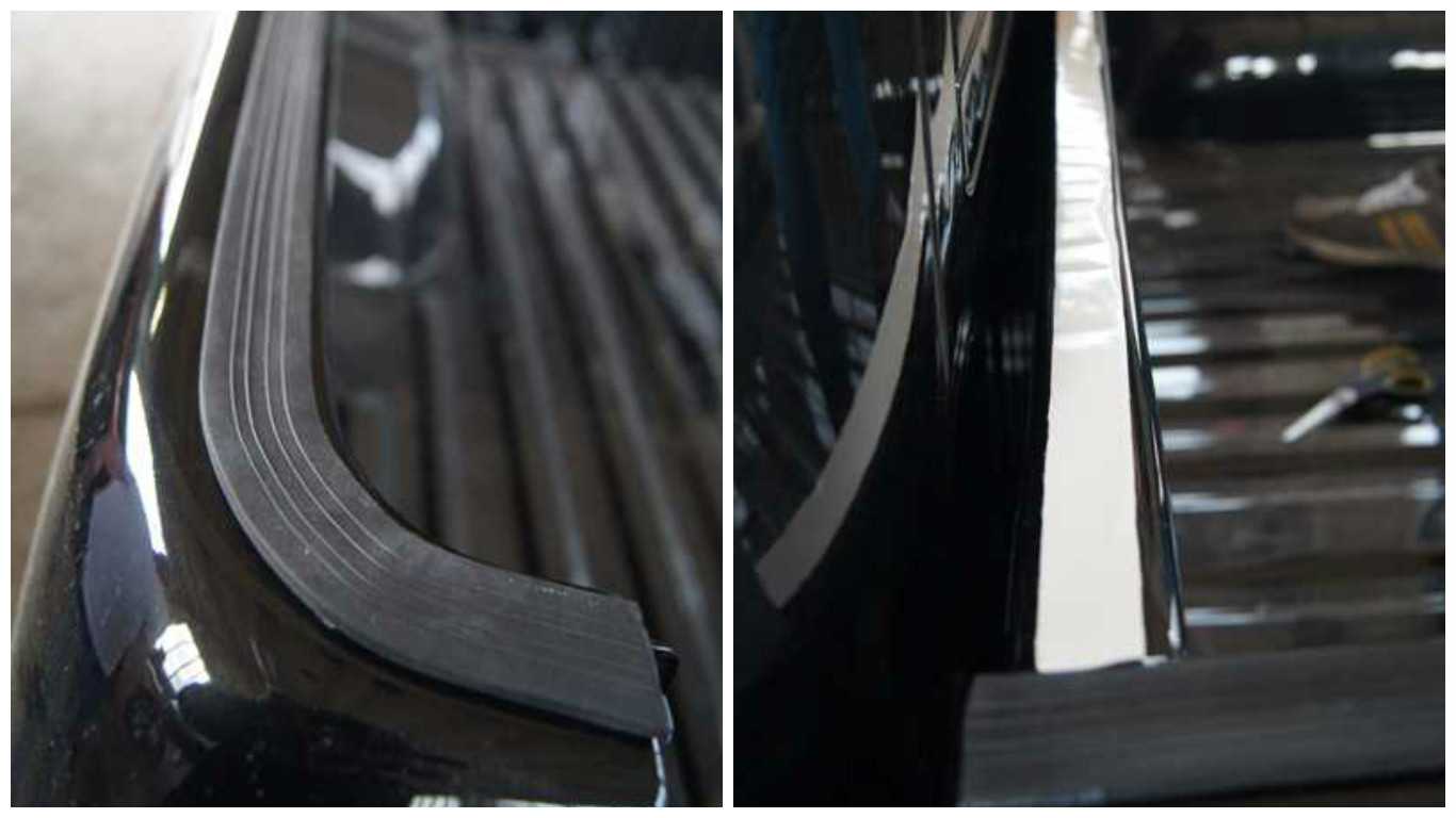 Наклеить защитной лентой вверх входящий в комплект резиновый уплотнитель по кромке обоих бортов, стараясь повторить имеющиеся изгибы, а пенополипропиленовый уплотнитель – по борту за кабиной. Защитная лента удаляется только перед непосредственной установкой кунга.