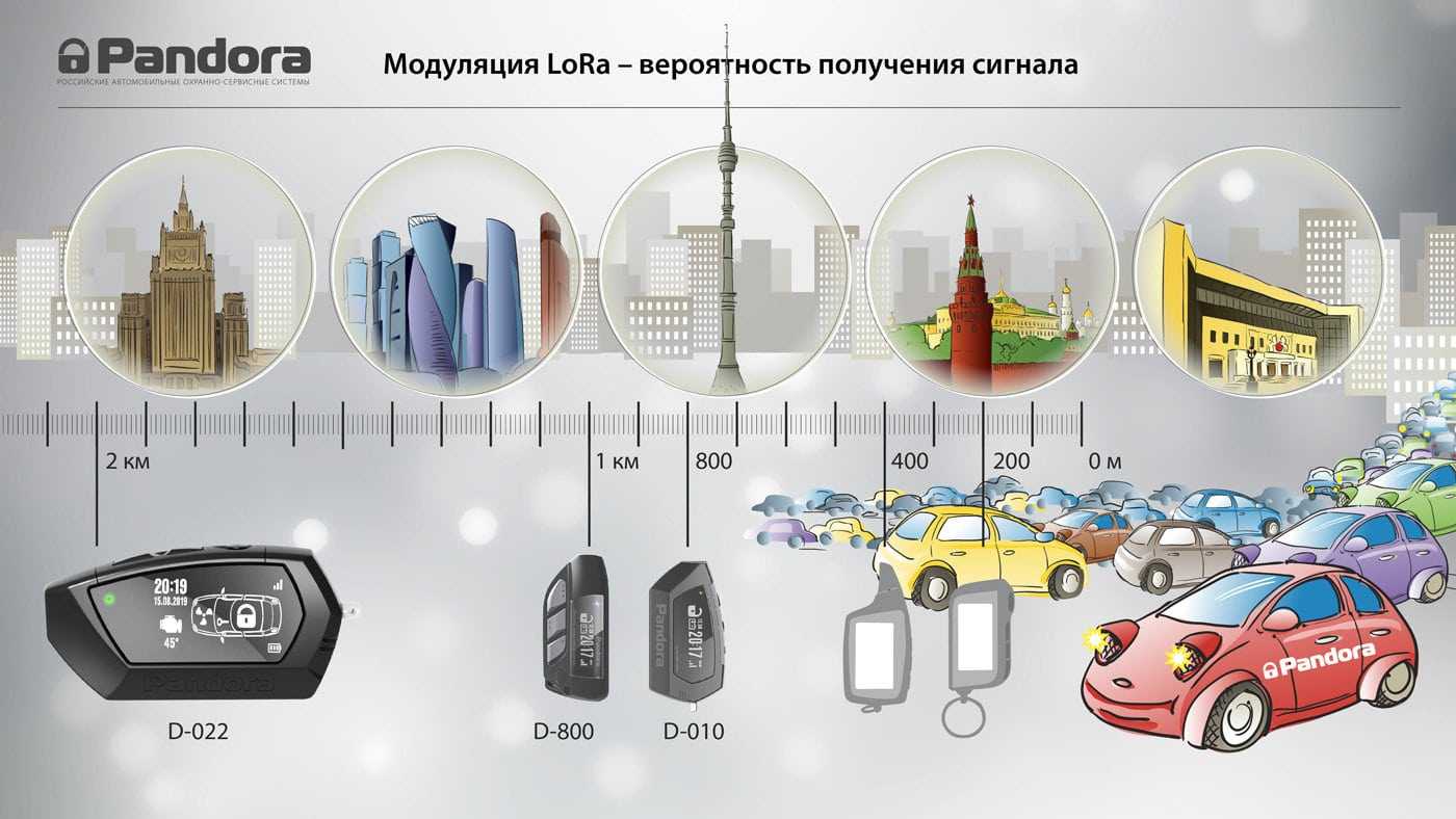 Если рассматривать дальность действия по этой картинке, то видно большое количество машин и здания Москвы. Следовательно, DX-91LoRa в условиях городских помех имеет вероятность получения сигнала оповещения до 2 км, а Pandora DXL 4970 (топовая система) имеет дальность 1 км. При этом по очертаниям брелков справа, видно, что StarLine имеет дальность 200 метров, а ScherKhan 400 метров.