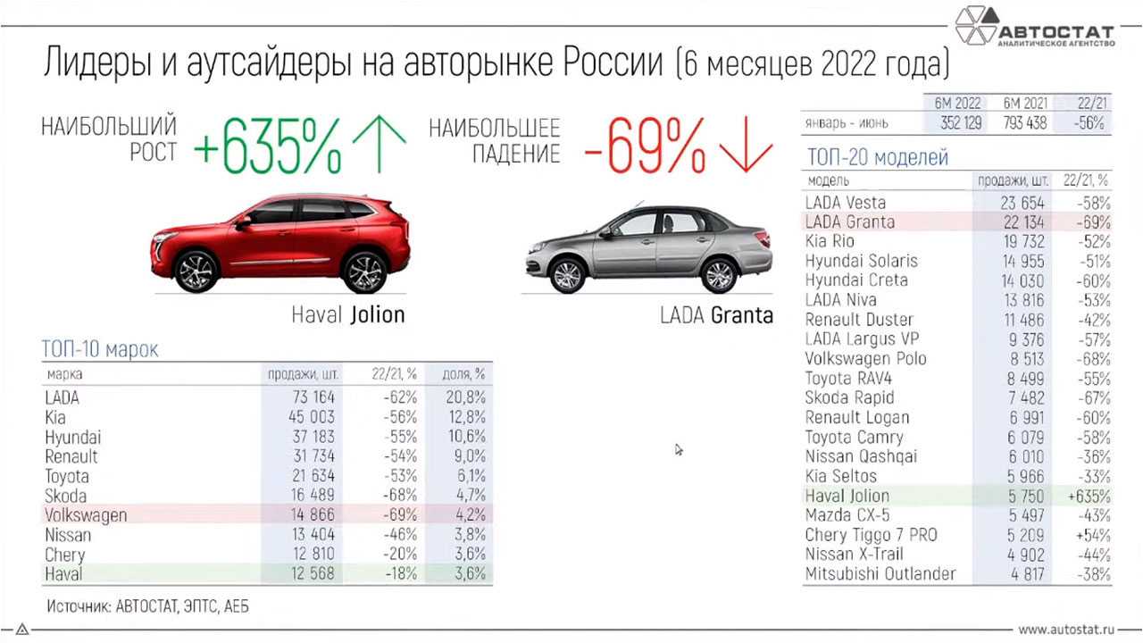 Среди отдельных моделей автомобилей мощный рост показал китайский Haval Jolion — плюс 635%. Наибольшее падение продаж у LADA Granta — минус 69%.