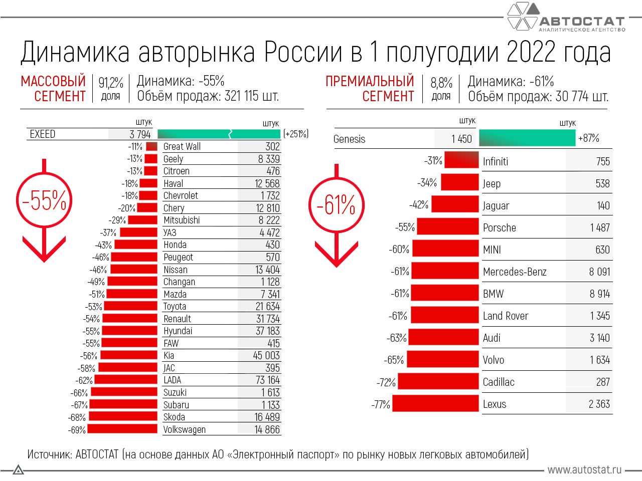 Премиальный сегмент. Продажи выросли только у Genesis — плюс 87%. Этот успех также связан с низкой прошлогодней базой. У остальных брендов катастрофа.