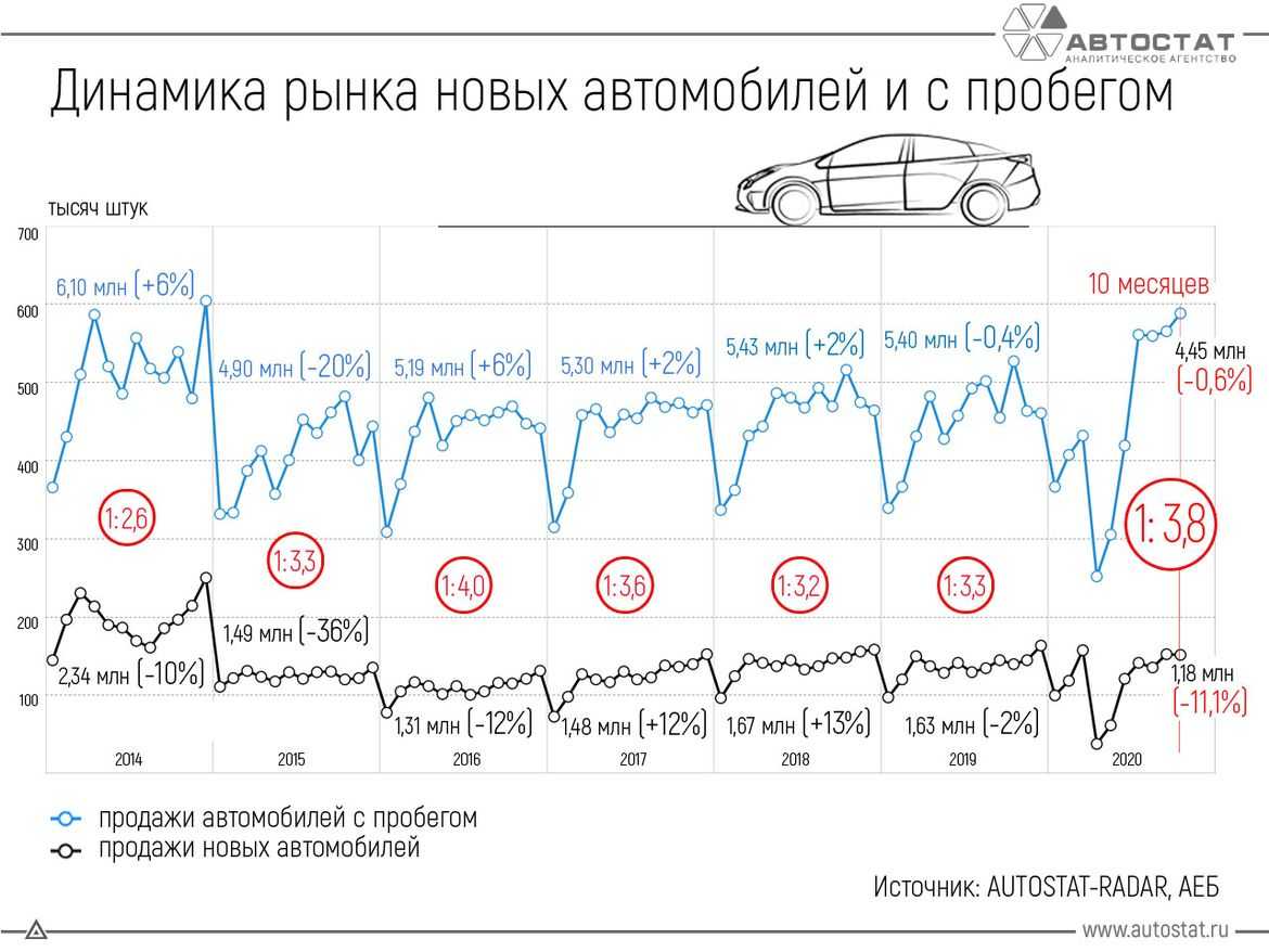 Своеобразная ситуация сложилась на вторичном рынке, который в очередной раз показал куда лучшую устойчивость и востребованность. По результатам 2020 года, несмотря ни на какие пандемии и локдауны, спрос на «бэушки» может как минимум удержаться на уровне 2019 года, а как максимум — выйти в небольшой плюс. Особенность пандемийного года в том, что дефицит новых машин привел к резкому всплеску спроса на слегка подержанные автомобили, в результате чего россияне за лето вымели с площадок Trade-in все более-менее достойные варианты. Как следствие, заметно подскочили цены на появляющиеся достойный б/у экземпляры.