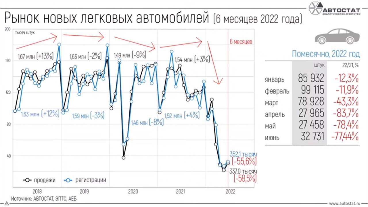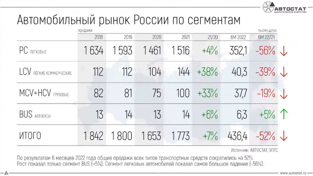 За шесть месяцев 2022 года продажи легковых автомобилей упали на 56% по сравнению с первым полугодием 2021 года. Продажи легких коммерческих автомобилей и грузовых автомобилей снизились на 39% и 19% соответственно. Рост продаж автобусов на 5% аналитики АВТОСТАТ связывают с поступлением госзаказов.