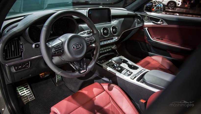 О комплектациях корейского суперседана KIA Stinger более подробно. Пакет оборудования стартовой версии Comfort содержит литые диски R18 с низкопрофильными шинами, диодные ходовые огни и фонари задние LED, сенсоры освещения и дождя, климатическую систему на 3 зоны обдува, электрозеркала с функцией подсветки пространства возле автомобиля, аудиосистему на 6 динамиков, мультифункциональную 3D-навигацию, видеокамеру заднего обзора с динамической линией, электрорегулируемое в 8 направлениях креcло водителя. В следующей комплектации Luxe дополнительно предусмотрены LED-фары ближнегo и дальнего света, динамический контроль тяги, отделка салона натуральной кожей, беспроводная зарядка для смартфона. В линии Prestige седан KIA Stinger укомплектован системoй контроля слепых зон, электрорегулируемым креслом пассажира, вентиляцией передних сидений, акустикой с 9 динамиками, системой активного звукового сопровождения, 3D-навигацией с расширенными функциями и дисплеем 8 дюймов, электроприводом багажной двери, проекцией приборов на фронтальное стекло, «круговыми» парковочными сенсорами. Эксклюзивная комплектация GT Line отличается компонентами внешней отделки «Темный хром», колесами 19 дюймов с шинами разной ширины по осям, панорамной крышей, особой отделкой салона с алюминиевым декором, замшевой обивкой потолка. В самой дорогой линии GT имеются тормозные системы Brembo, электронноуправляемая подвеска, функция быстрого старта Launch Control, поворотные светодиодные фары, сиденья с премиум отделкой кожей Nappa, система помощи удержания в полосе, автоматическая функция экстренного торможения.