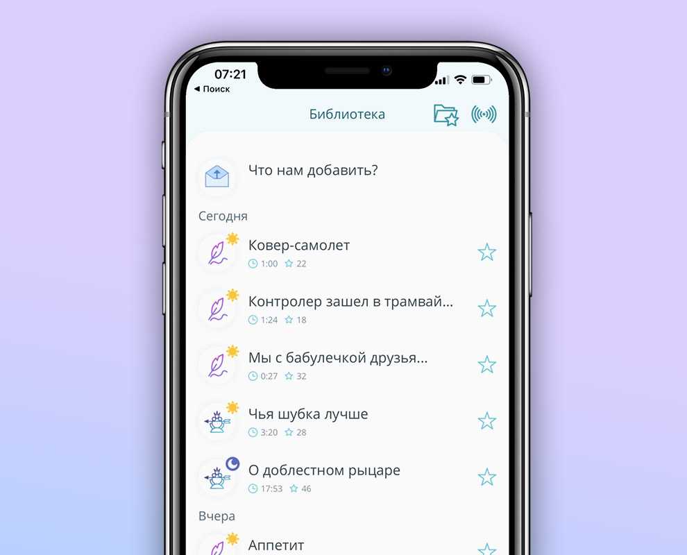 Расскажет сказку или историю. Помимо предустановленных четырёх, в приложении есть два десятка других сказок. Каждую можно вызвать вручную или «повесить» на физическую кнопку «Избранное» в лапе Мишки. Список доступных сказок обновляется каждый день, но он в целом статичен: 7 дней, в каждом 4-5 записей.