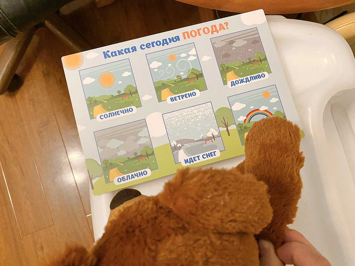 Игра уже в обратную сторону повернулась: Тима у Мишки спрашивает, где какая погода. Мне как родителю хочется ещё. Скажем, плаката с животными. Или с алфавитом. Физическая интерактивность важна не меньше, чем разговорная.