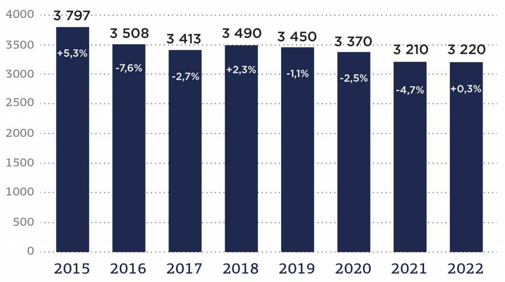 Если рассматривать динамику изменений количества дилер-центров с 2015 года, то можно увидеть сокращение на 15% (сравниваются данные на начало каждого года) Причем каждый год, кроме 2015 и 2018 годов, наблюдался спад. А с 2019 по 2021 сокращение из года в год становилось все более крупным: -1,1%, -2,3%, -4,7% соответственно.