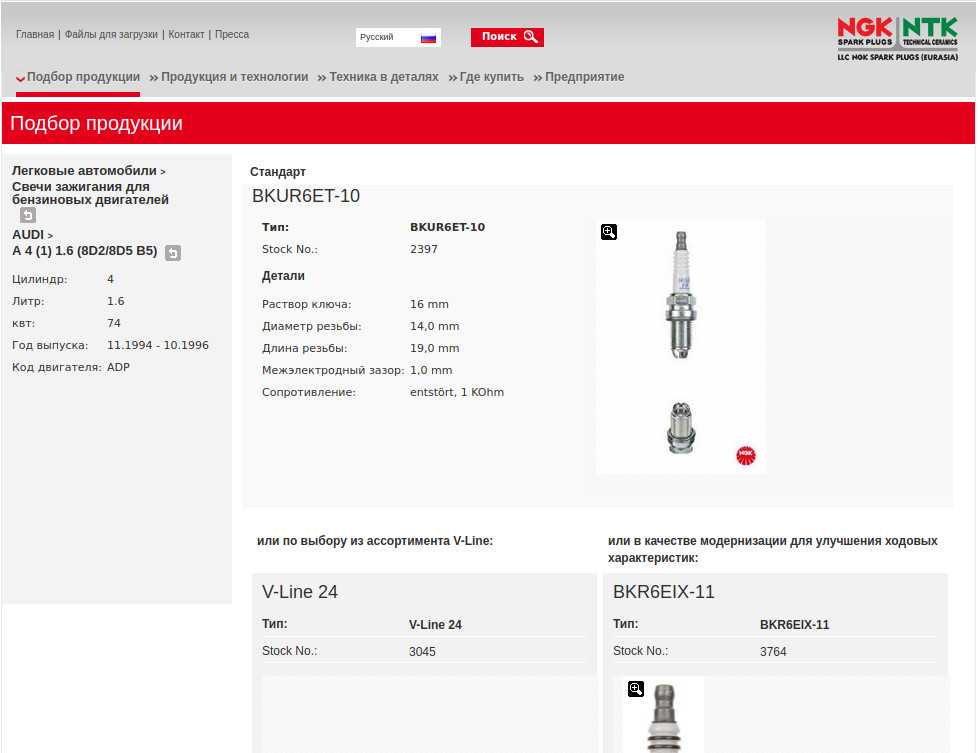 На странице поиска (http://www.ngk.de/nc/ru/podbor-produkcii/) официального сайта компании, пользующегося большой популярностью в мире, представлен большой ассортимент комплектующих для авто. Это самый большой каталог свечей зажигания NGK онлайн. Чтобы быстрее найти нужную информацию, следует перейти по следующим категориям товаров: