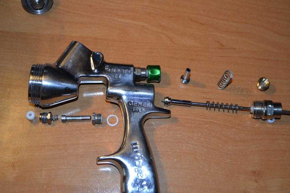 Как несложно догадаться этими местами будут те части, через которые проходит лакокрасочный материал: краска, растворитель и лак. Это, конечно, емкость для материала, канал подачи краски, сопло окрасочной головки, сама головка и дозирующая игла.