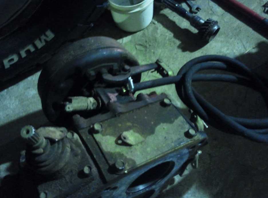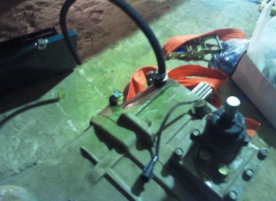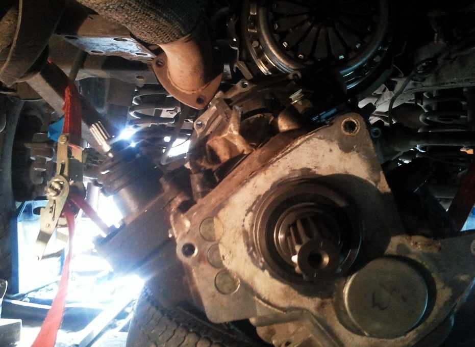 - Манипуляции с коробкой передач — снимают рукояти, сливают масло, отсоединяют тросик ручной передачи. Снимают разъемы, болты, коробку отбора мощности. С домкратом работы пройдут быстрее и легче.