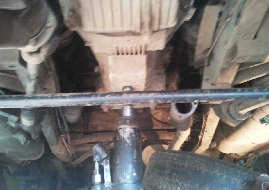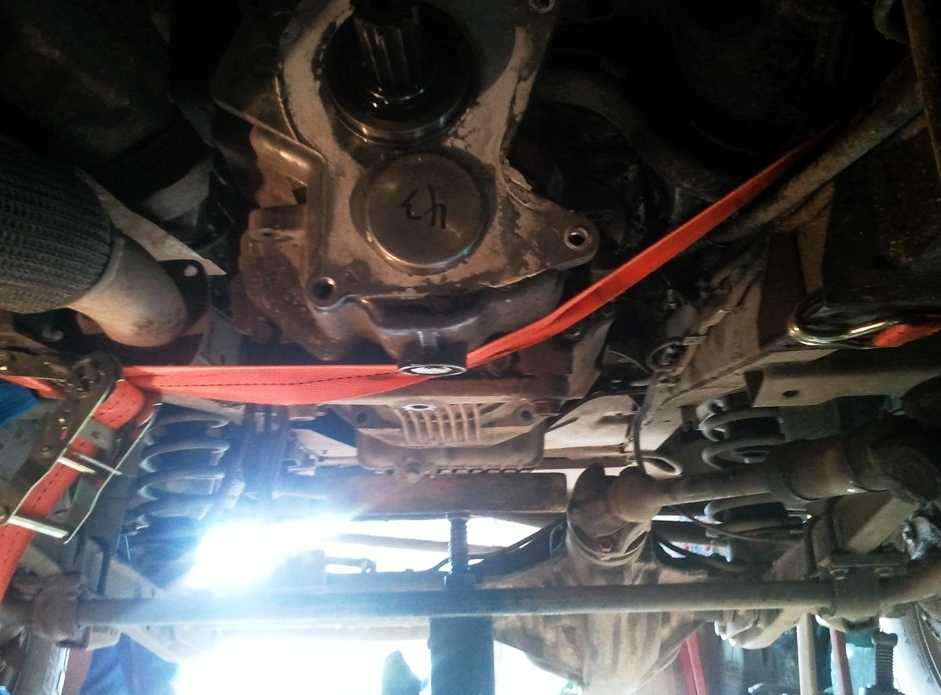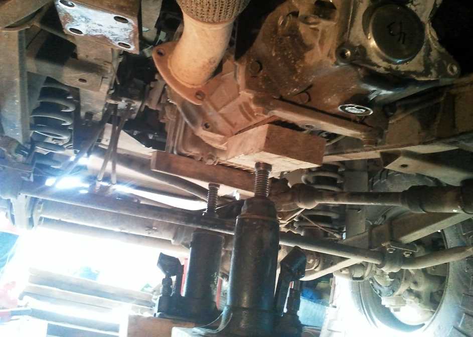 Начинаем снимать МКПП УАЗ Патриот. Для того, чтобы ее было легче снять поддомкрачиваем ее снизу.