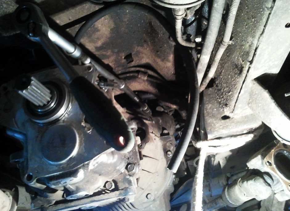 Для страховки можно использовать капроновые стропы. Откручиваем весь крепеж кожуха сцепления. Часть крепежа потребует применения удлинителей. Без них снятие КПП практически нереально.