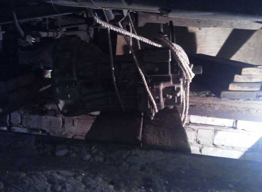 Теперь устанавливаем КПП на место. Поднимаем КПП с помощью веревок, перебросив их через раму.