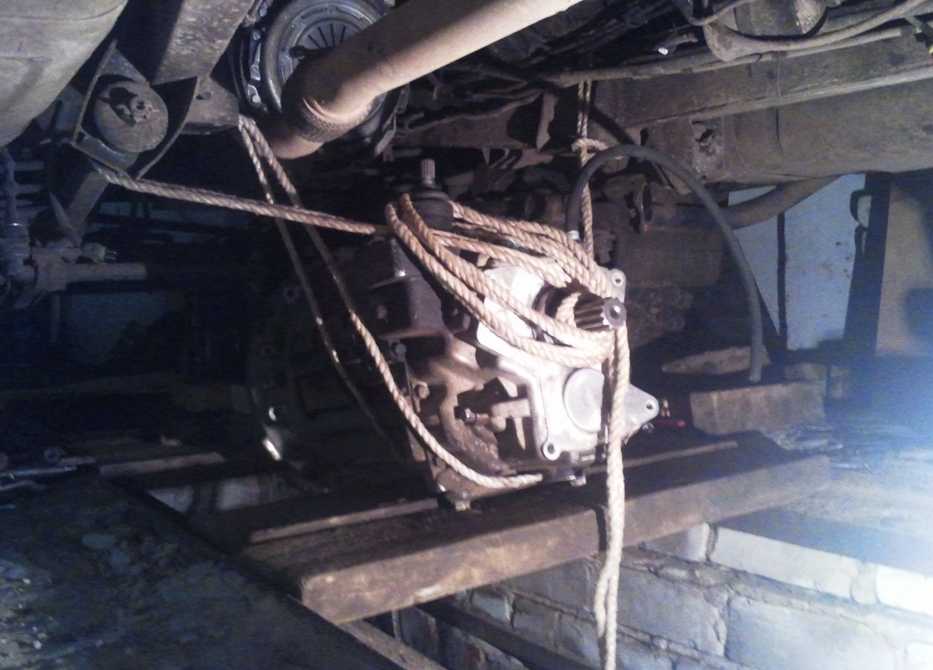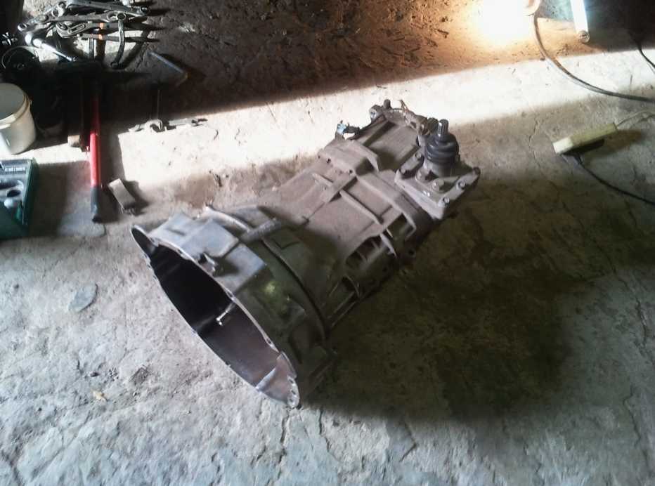 Снимаем КПП с машины. Коробка тяжелая, поэтому вам потребуются помощники. Коробку лучше уложить на старую шину, чтобы не побить ее корпус.