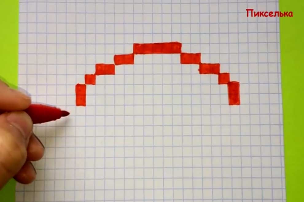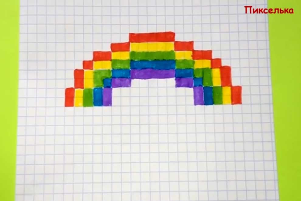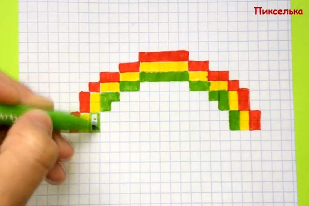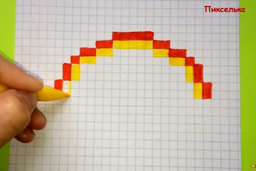 Берём и дорисуем ниже жёлтым цветом ещё дугу под красной полоской в таком же количестве клеток, примыкая вплотную.