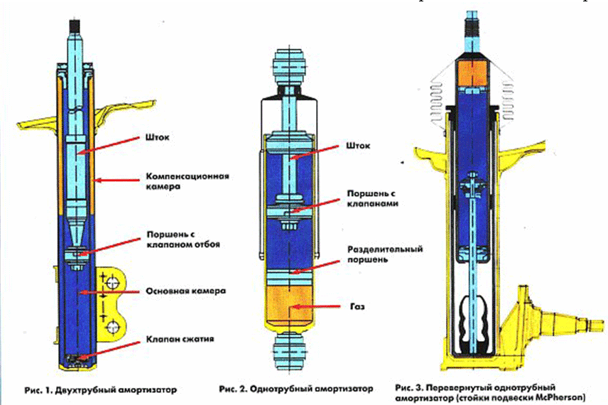 - Рабочий состав циркулирует во внутренней части обеих камер, на основании чего все стойки, как и стандартные амортизаторы, разделяются на несколько видов.