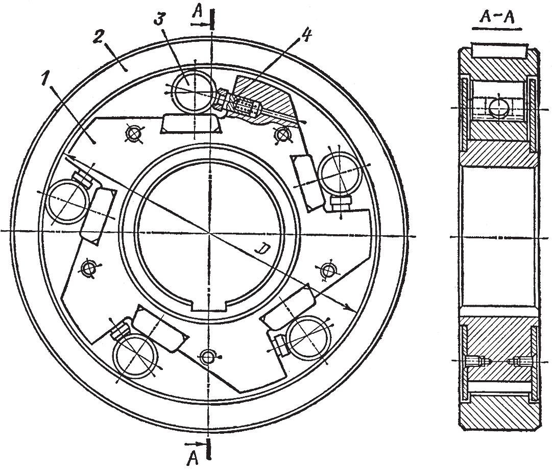 По устройству центробежные муфты представляют собой фрикционные муфты, у которых механизмом управления служат грузы-колодки 1 (рис. 13), находящиеся под действием центробежных сил. При достижении ведущим валом заданной угловой скорости центробежные силы, действуя на грузы, производят включение муфты. Передача вращающего момента осуществляется силой трения, пропорциональной квадрату угловой скорости.