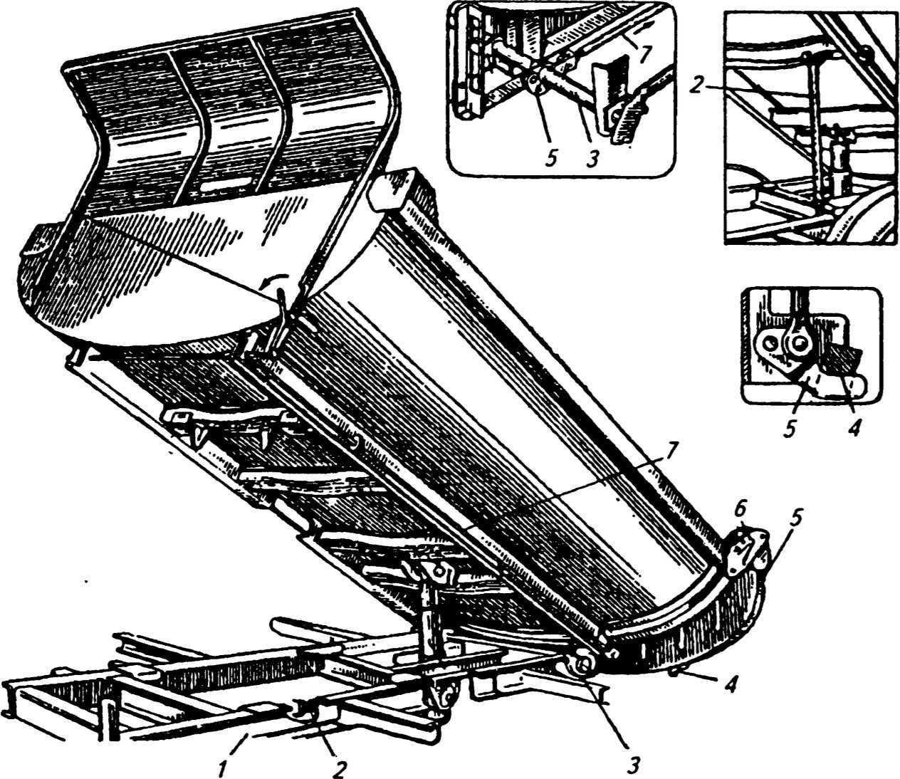 Рисунок 8 – Кузов самосвала: 1 – продольная балка; 2 – упорная штанга; 3 – ось опрокидывания; 4 – цапфа; 5 – запорный крюк; 6 – ось подвески заднего борта; 7 – тяга