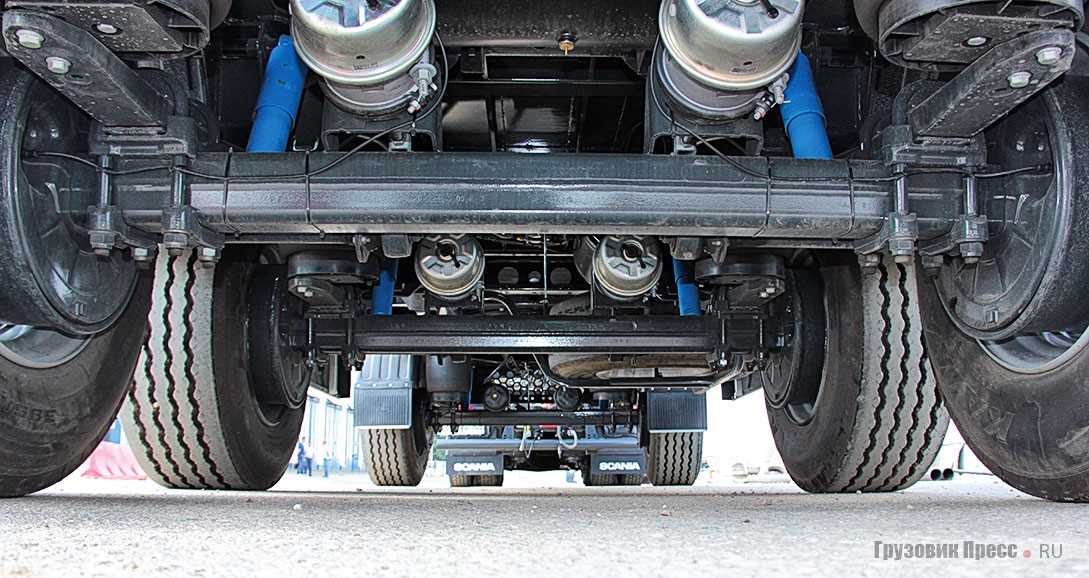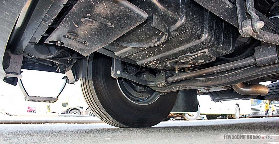 Из установленного на раме оборудования стоит обратить внимание на вместительный 650-литровый топливный бак. Вариант шасси 6х2 с пневмоподвеской интересен тем, что он легче традиционного полностью рессорного исполнения почти на 2 т, что увеличило эффективность