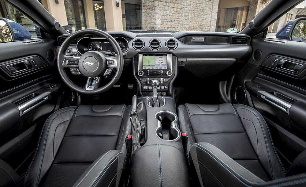Интерьер у Ford Mustang смотрится стильно и породисто. Немного даже напоминает кокпит спортивного самолёта. Есть все блага цивилизации в виде сенсорного экрана мультимедийного экрана, системы управления климатом. Приборная панель зависит от комплектации. Это могут быть как простые аналоговые шкалы с бортовым компьютером посередине, так и цифровая приборная панель в виде 12-дюймового дисплея.