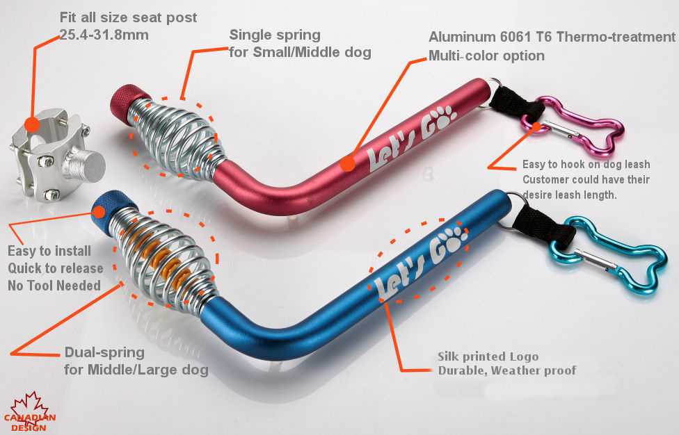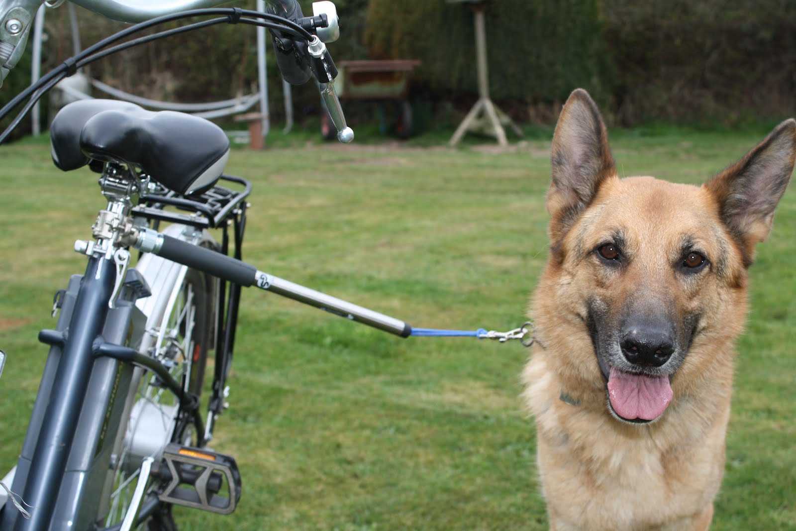 Лучше всего приобрести специальные велосипедные крепления типа Springer, WalkyDog или The Lets Go, тогда ваши руки будут устойчиво находиться на руле, а собака будет бежать на безопасном расстоянии от велосипеда сбоку. Springer крепится к раме, а WalkyDog к седельному стержню. Оба устройства снабжены специальным пружинным механизмом, позволяющим сглаживать собачью тягу и рывки. BikerDog крепится к задней части рамы возле колеса и оснащён гибким пластиковым стержнем для контроля рывков. Лучше выбрать шлейку, а не поводок, чтобы не создавать чрезмерную нагрузку на шею собаки.