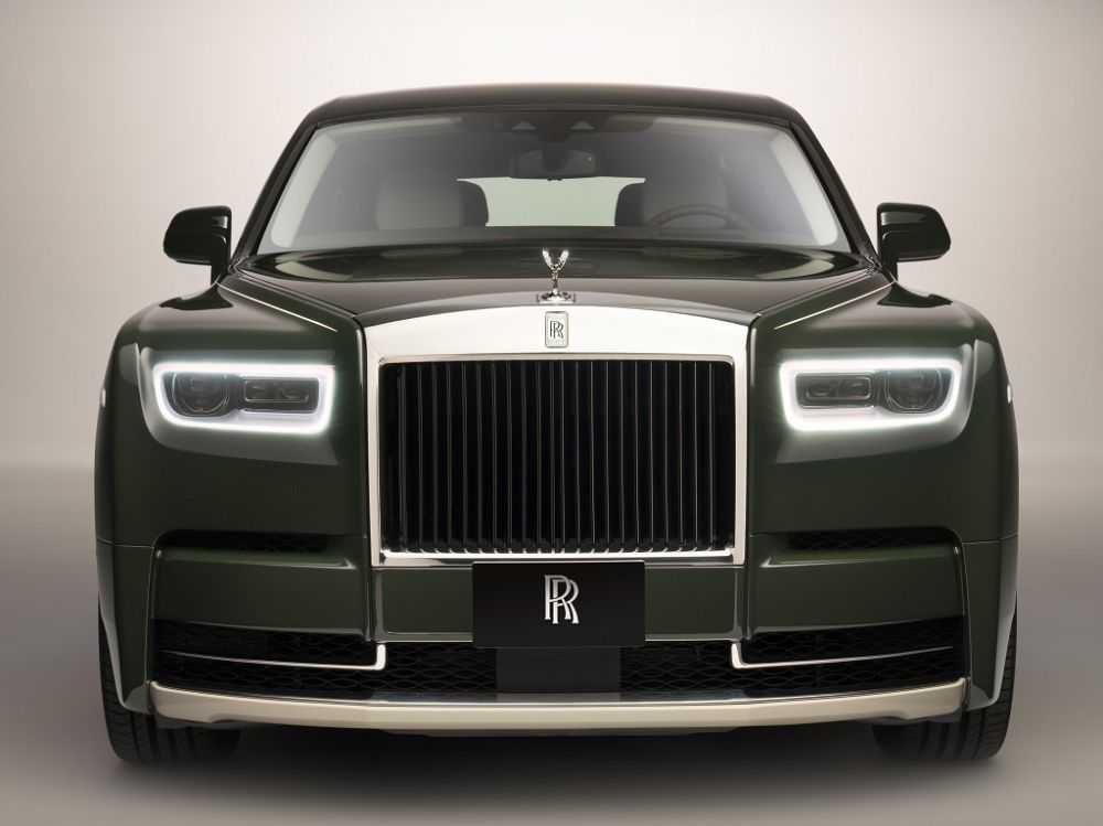 Сохранив особенности стиля брендовой кузовной компоновки, модернизированный Фантом образца 2022 года смотрится по-прежнему элегантно и презентабельно, в то же время более современно. На фото в переднем ракурсе люксовый заднеприводный седан предоставляет для обзора: