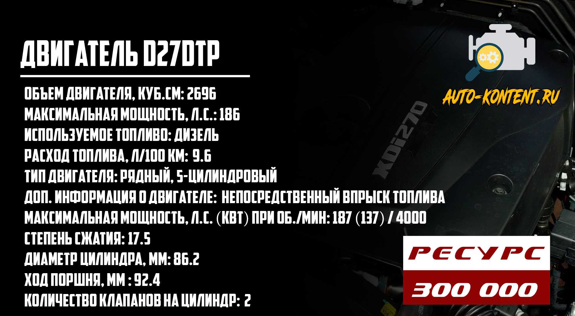 Аналогом дизельного мотора D27DT является 2.7-литровая 5-цилиндровая рядная установка под индексом D27DTP. Мотор с непосредственным впрыском топлива и 10-клапанной головкой блока цилиндров. Однако за счет усиленного турбонагнетателя данный силовой агрегат способен выдавать вплоть до 180 лошадиных сил и 402 пикового крутящего момента с выходом на 3000 оборотов в минуту. Его цилиндры расточены под 86.2 мм, а поршни ходят на 92.4 мм. Также корейскими инженерами были внедрены и другие принципиальные изменения. Например, в движке D27DTP стоят совершенно другие форсунки, модифицированная дроссельная заслонка, иной электронный блок управления двигателем с собственной прошивкой, решили сменить и маслоотделитель. Подобные изменения положительно сказались на динамических показателях авто, но в ущерб ресурсу. Ресурс двигателя СсангЙонг Рекстон в лучшем случае составляет 300 тыс. км.