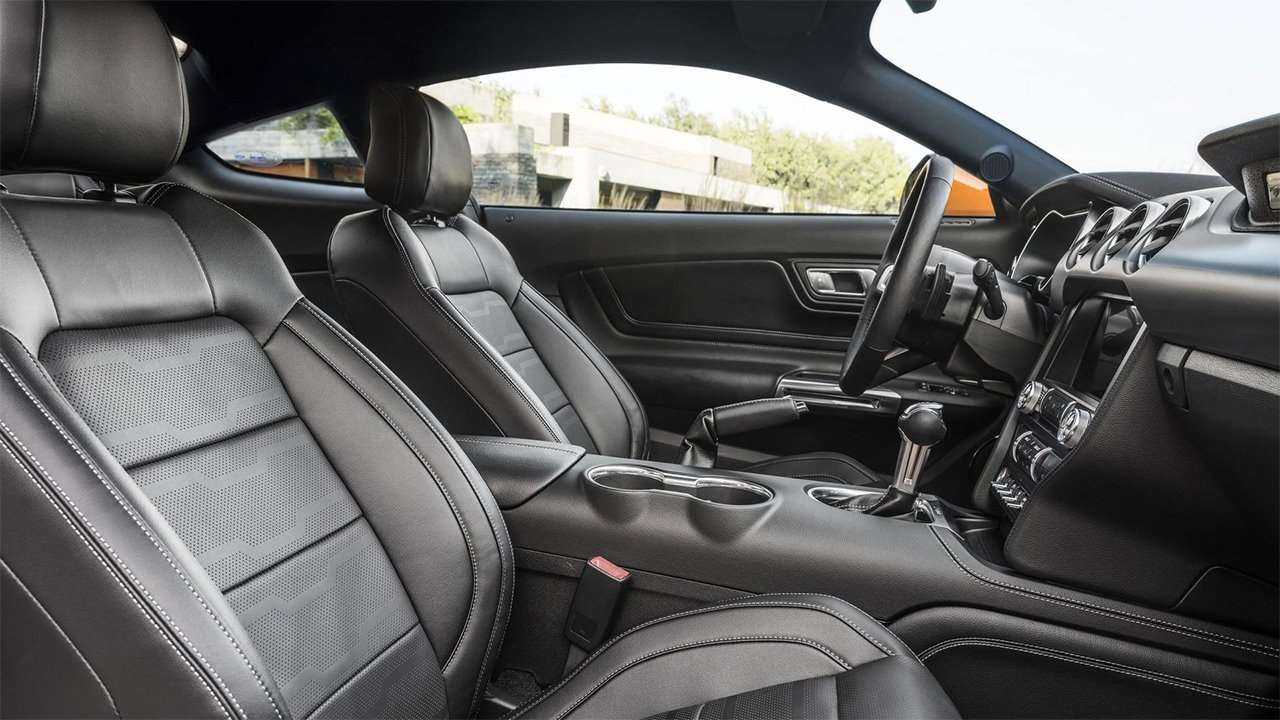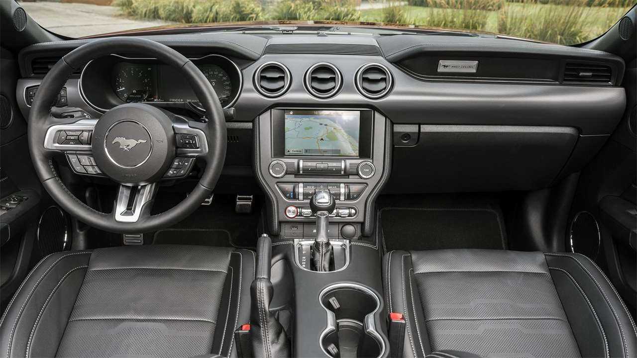 Современный Mustang имеет классическую конфигурацию салона «2+2». Сосредоточен автомобиль исключительно на передних сиденьях. Водитель и пассажир имеют достаточно личного пространства и очень удобные сиденья, которые идеально подходят для длительного пребывания. Базовые модели имеют механические настройки кресел, в то время как высшие комплектации Ford Mustang порадуют автоматическими режимами. Стандартно сиденья обшиты тканью, версия Premium предлагает кожаную обшивку, подогрев и вентиляцию. Два задних сиденья очень малы, поэтому о полноценном размещении на них взрослых пассажиров речь не идет. А поскольку автомобиль имеет только две двери, добраться обратно тоже непросто. В моделях Shelby беспокоиться о заднем пространстве вообще не приходится, задних сидений не предусмотрено. Как бы там ни было, но в стандартных моделей сзади есть два полных набора креплений детского кресла LATCH. Если отойти от вопроса пространства, то стоит отметить высокое качество отделочных материалов и сборки. Дизайн интерьера достаточно современный для того, чтобы выделяться на фоне автомобилей, которые только называются спортивными. Багажник купе вмещает 368 литров. Грузовой объем кабриолета составляет 311 литров. Базовая комплектация Mustang вряд ли поразит, ведь предлагает только систему «SYNC» с функцией активации голосом и маленьким дисплеем. Модели 2021 будут стандартно оснащены системой «FordPass Connect», благодаря которой через смартфон можно открыть/закрыть автомобиль дистанционно, завести двигатель и проверить остаток топлива. Модели с автоматической коробкой передач имеют функцию дистанционного запуска. Доступная информационно-развлекательная система SYNC 3 предлагает 8.0-дюймовый сенсорный экран, Android Auto, Apple CarPlay, спутниковое радио и девять динамиков.