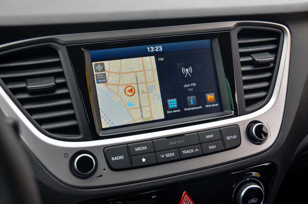 Зато Accent уже «в базе» имеет шесть подушек безопасности, мультимедиасистему с пятидюймовым экраном и камеру заднего вида. В списке опций — семидюймовый дисплей (как у Соляриса) и система автоматического торможения. А еще есть система Drive Mode Select: кнопкой на центральной консоли водитель может выбрать режим Eco или Active, которые отличаются характером силового агрегата и усилием на руле.