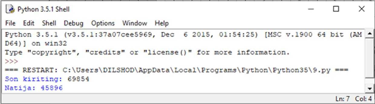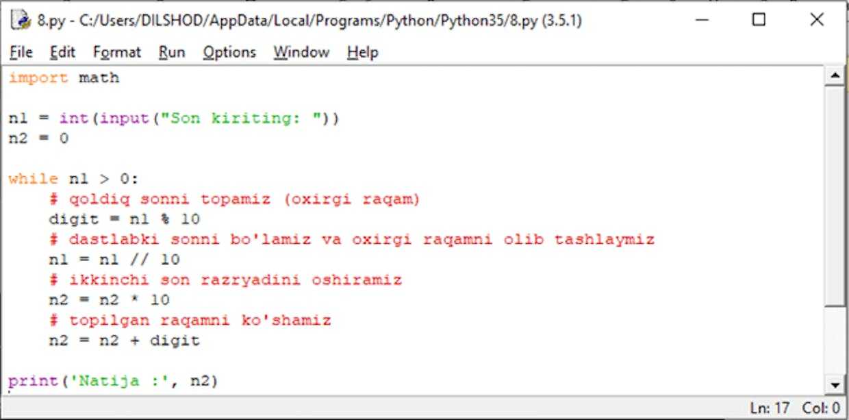 Foydalanuvchi bir necha xonali son kiritganda, uning raqamlarini teskariga yozish dasturini tuzish lozim. Misol uchun 3658 sonini 8563 ko’rinishida yozish. Buning uchun quyidagi algoritmni ishlab chiqamiz.