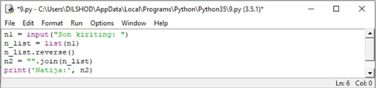 Masalani bunday algaritm bilan hal qilish barcha dasturlash tillari uchun mos tushadi. Python esa bunday hollar uchun reverse() metodini ishlab chiqqan. Bu metod berilganlarni teskari tartibda yozish imkonini beradi. join() satr metodi bilan esa barchasi bir satrga birlashtiriladi.