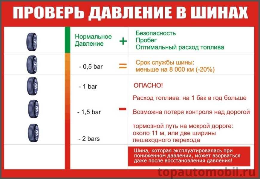 Соответствующее паспортной норме, а также температуре воздуха, состоянию дороги, полной массе автомобиля на конкретный момент давление в шинах существенно продлит срок их эксплуатации. Также это отражается на расходе топлива и масел.