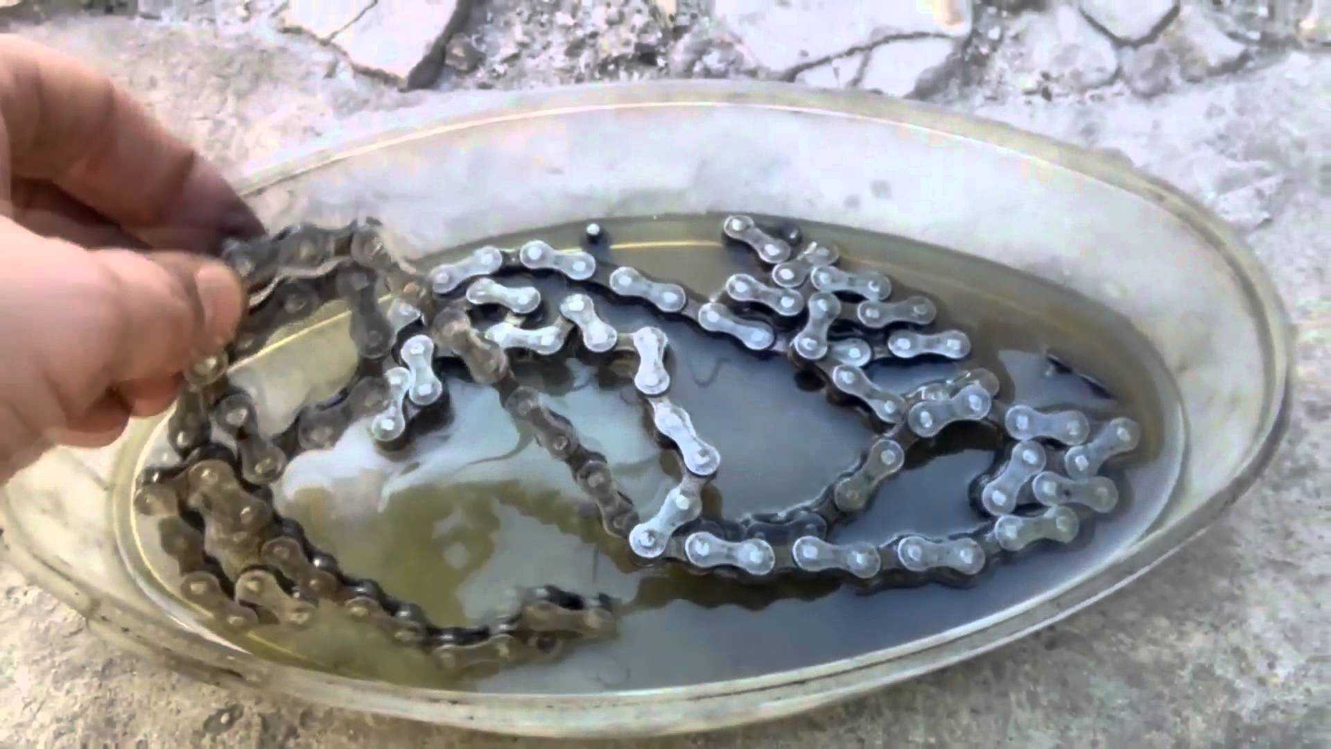 - Сняв цепь и проварив ее в масле — позволяет средству проникнуть в самые труднодоступные места. Вынув из разогретого вещества и тщательно вытерев, цепь устанавливают на место.
