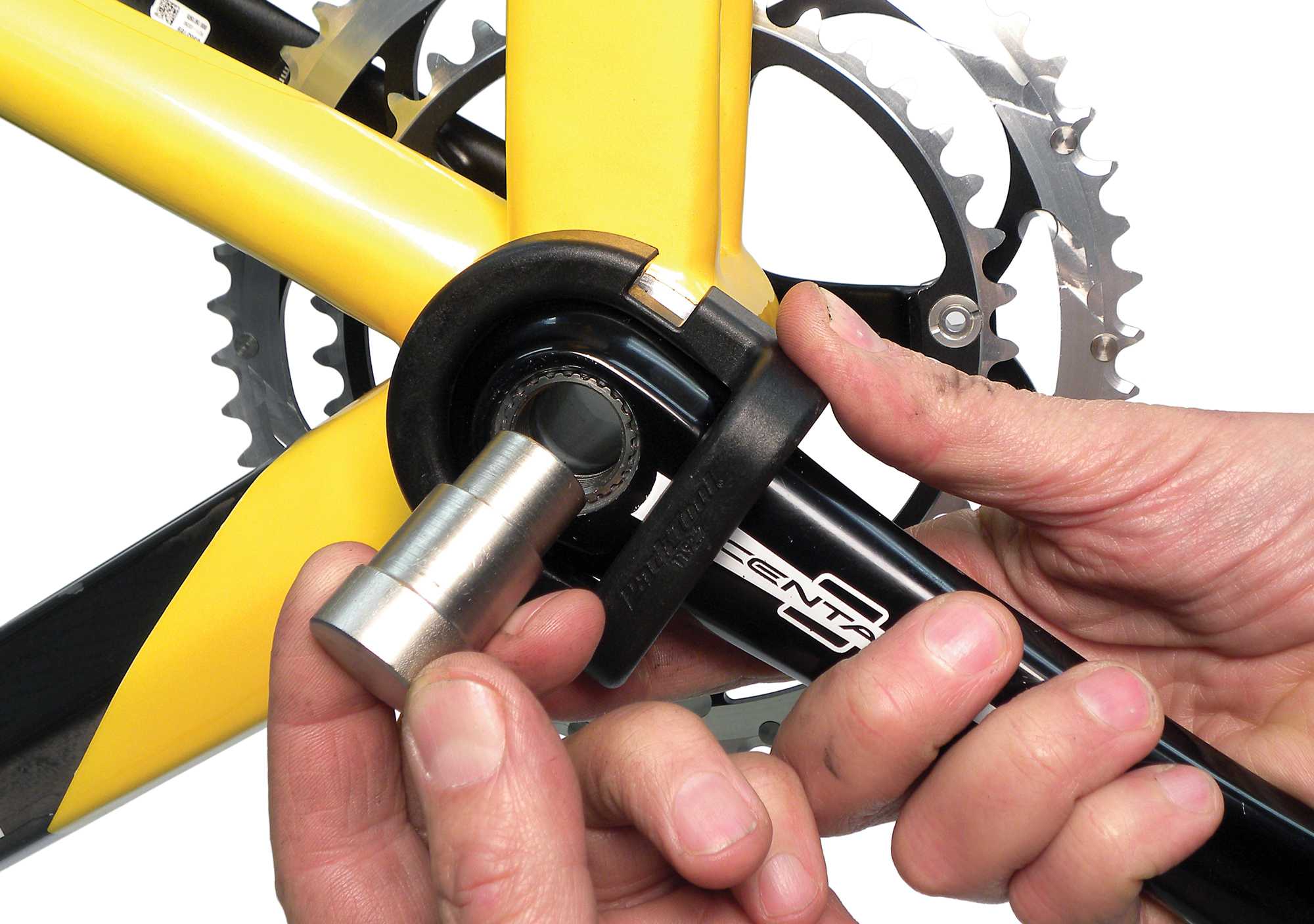 В нашем случае мы используем съемник каретки Shimano. Для каждой отдельной модели каретки предусмотрен подходящий съемник. Так, для кареток Hollowtech II, Howitzer, GXP применяется съемник для интегрированных чашек кареток, а для кареток Shimano, SRAM и Truvativ можно использовать так называемый съемник для кареток стандарта ISIS. Стоит отметить, что в комплектацию съемников зачастую входят рукоятки, что освобождает от необходимости дополнительно применять разводной ключ