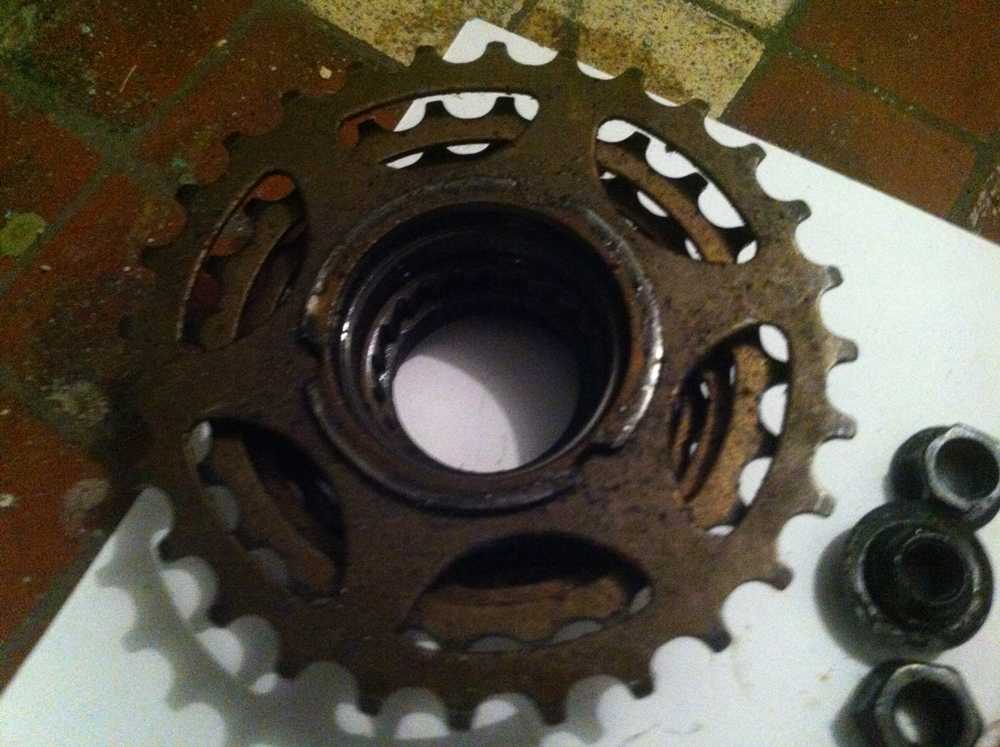 - Внимательно осмотрите кассету. Если она сильно загрязнена, придется снимать ее с колеса и чистить. При небольшом загрязнении можно очищать кассету велосипеда от загрязнений, не снимая с колеса;