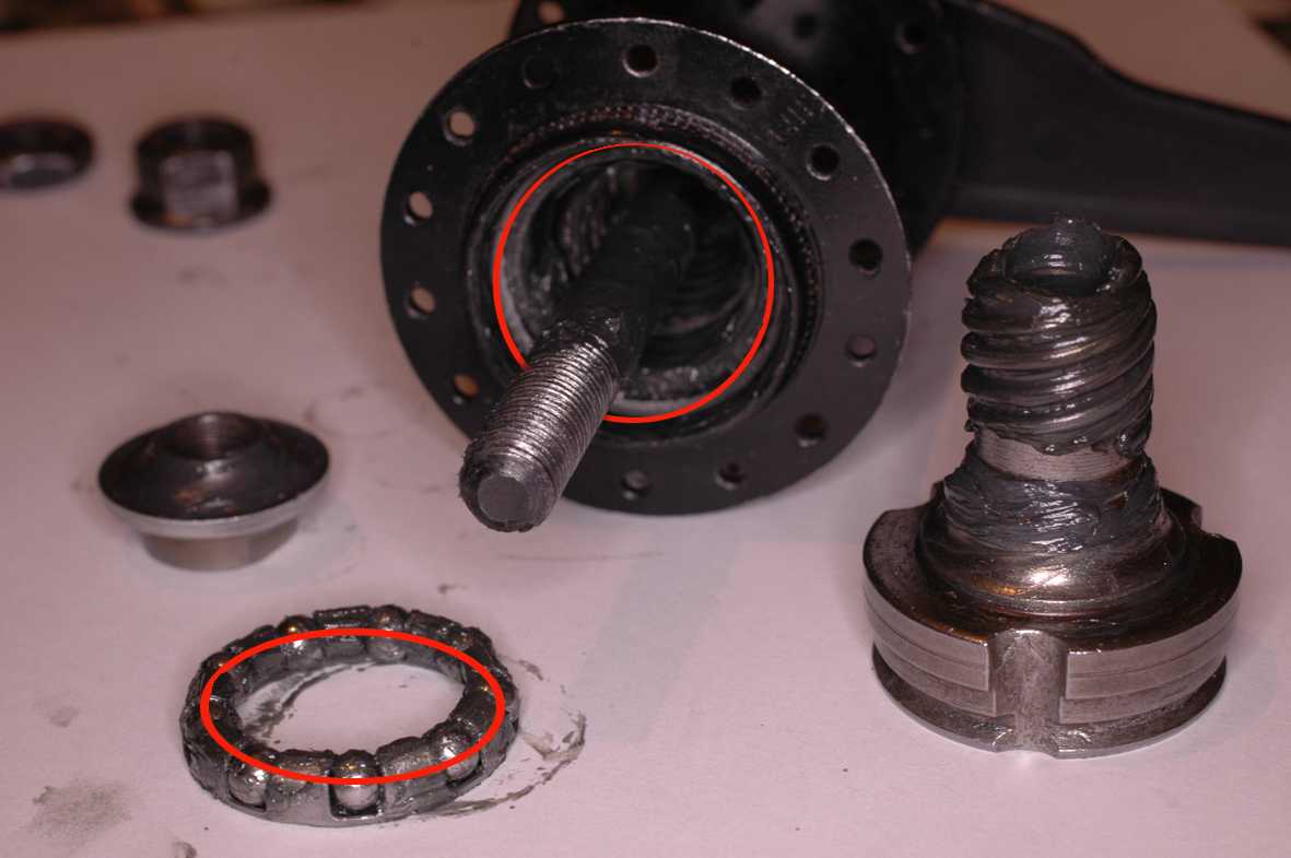 - изнашивание радиусной гайки (по-другому конус) и повреждение дорожек качения подшипников;