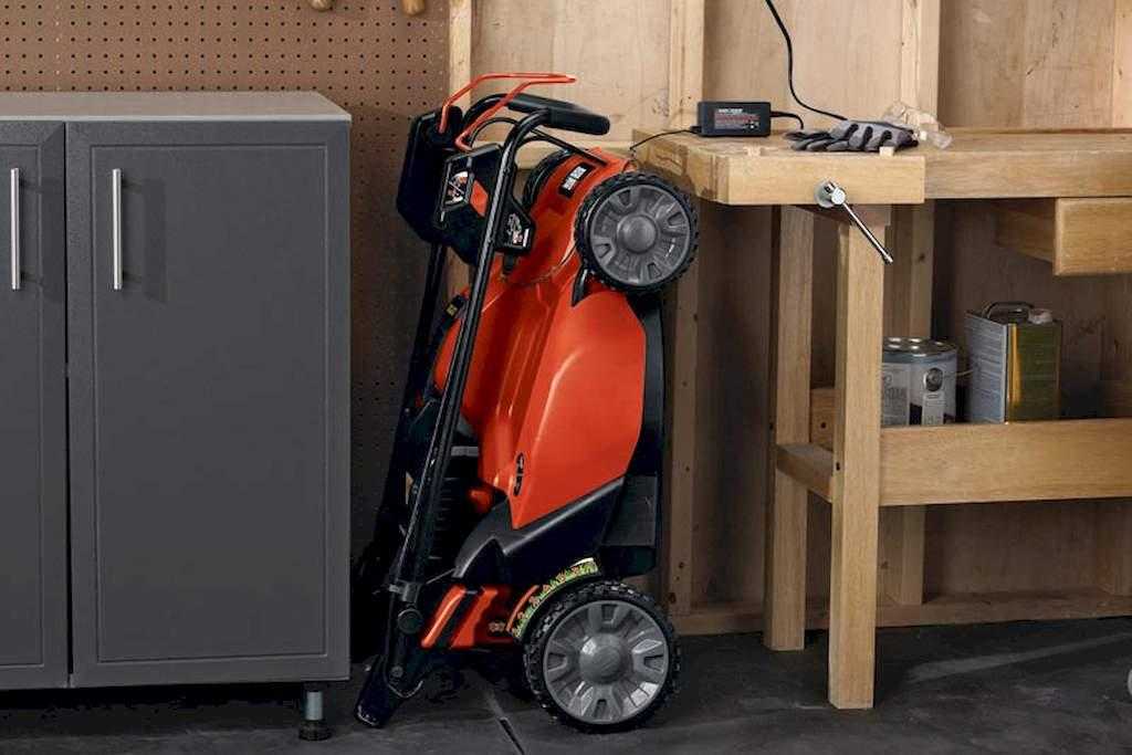 Хранить газонокосилку можно вертикально или горизонтально. Однако лучше предусмотреть возможность расположения устройства так, чтобы его ножки не касались пола. С учетом этого больше всего проходит вертикальное положение устройства – на возвышении.