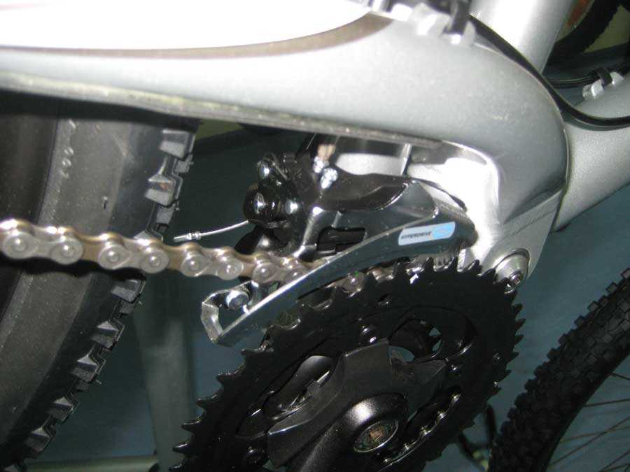 Обратите внимание: в данном случае, если перебрасыватель уже сильно изношен, для облегчения процесса установки/регулировки нужно сместить его рамку по направлению к колесу. Во многих случаях именно такого минимального смещения рамки и не хватает для перебрасывания цепи в нужное положение