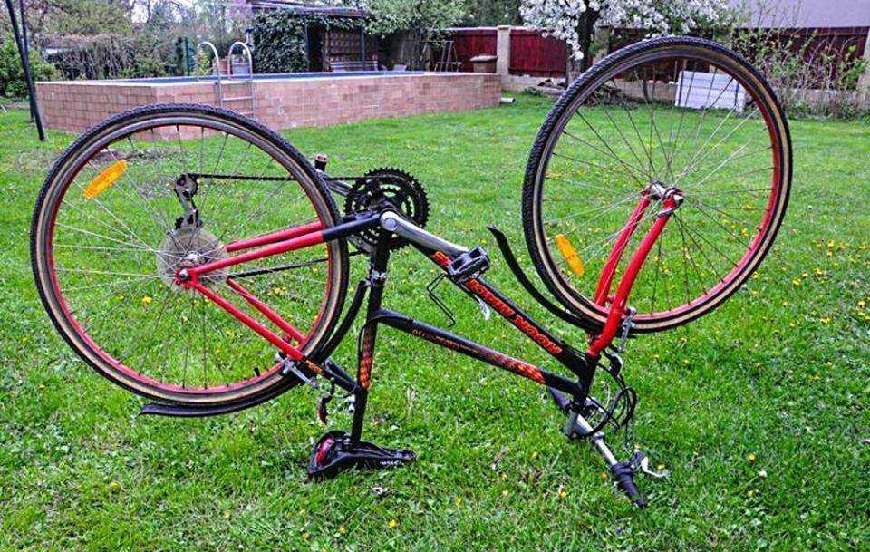 Установка велосипеда на руль и седло посредством простого переворота конструкции вверх колесами