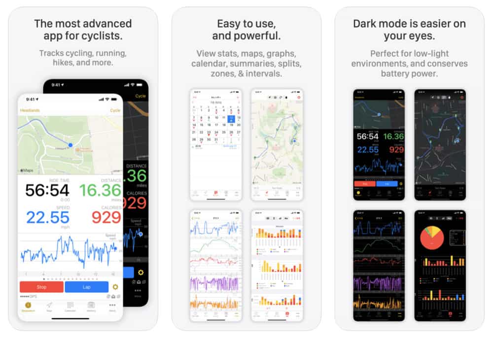 Велосипедное приложение под завязку набито различными функциями и потому считается едва ли не самым лучшим для iOS. На основе собранных данных, клиент строит диаграммы, графики, ведет статистику, составляет отчеты. Cyclemeter оснащен массой звуковых уведомлений, подсказывающих местоположение велосипедиста. Помимо этого, полученной приложением информацией можно делиться с друзьями и близкими или чтобы похвастаться или с целью обезопасить себя во время экстремальных заездов. В клиенте также присутствует помощник, который в зависимости от типа поездки, будь то легкая прогулка по улицам своего города или же длительное путешествие, подскажет как к ней приготовиться. Информация полученная клиентом экспортируется в большое количество форматов: .CSV, .KVL и прочие.