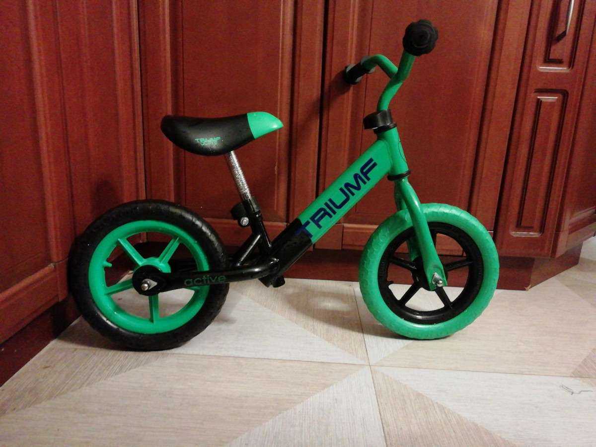 Предназначается для детей 2-5 лет весом до 40 кг. Оснащается ручным тормозом и надувными колесами из резины в 12 дюймов, обеспечивающих удобное передвижение по асфальту и по грунтовой дороге. Конструкция оснащается подставками для ног, которые имеют противоскользящее покрытие. Рама изготовлена из легкого алюминия, ввиду чего беговел имеет небольшой вес. Седло можно регулировать в высоту — 30-43 см. Высоту руля также возможно изменить – 45-60 см. Потому транспортное средство используется в течение нескольких сезонов. Родители, которые купили Triumf Active AL1201, отмечают яркий внешний вид и надежность изделия. Среди недостатков выделяют отсутствие брызговиков.