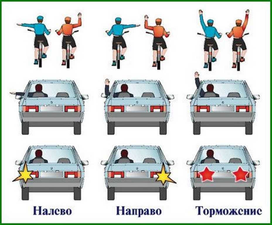 Согласно правилам во время движения по дорогам общего пользования велосипедист должен перед совершением маневра подавать сигналы. За счет того, что конструктивно велосипед не имеет светосигнализации, подавать подобные сигналы необходимо жестами.