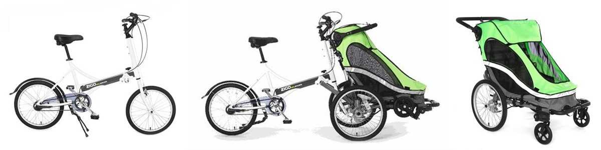 , она же последняя, трансформация Zigo – велосипедная коляска-прицеп для двух детей, она же просто велоприцеп. Прицепляется сзади к велосипеду специальным удерживающим устройством.