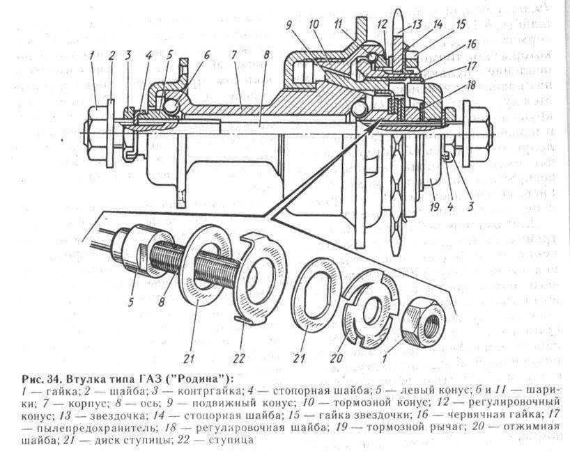 Схема монтажа: правые подшипники – ось колеса – конус – левые подшипники – стопор – шайбы и заклепки – контргайка.
