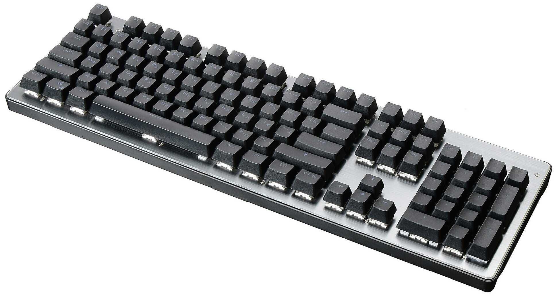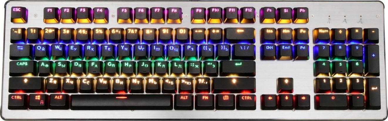 Заслуженное первое место нашего рейтинга занимает клавиатура OKLICK 970G Dark Knight, которая имеет не только приятный внешний вид, но также полноразмерный форм фактор, заманчивую стоимость, а также удобную регулировку подсветки. Кроме этого выделим, жесткий провод и заманчивую стоимость