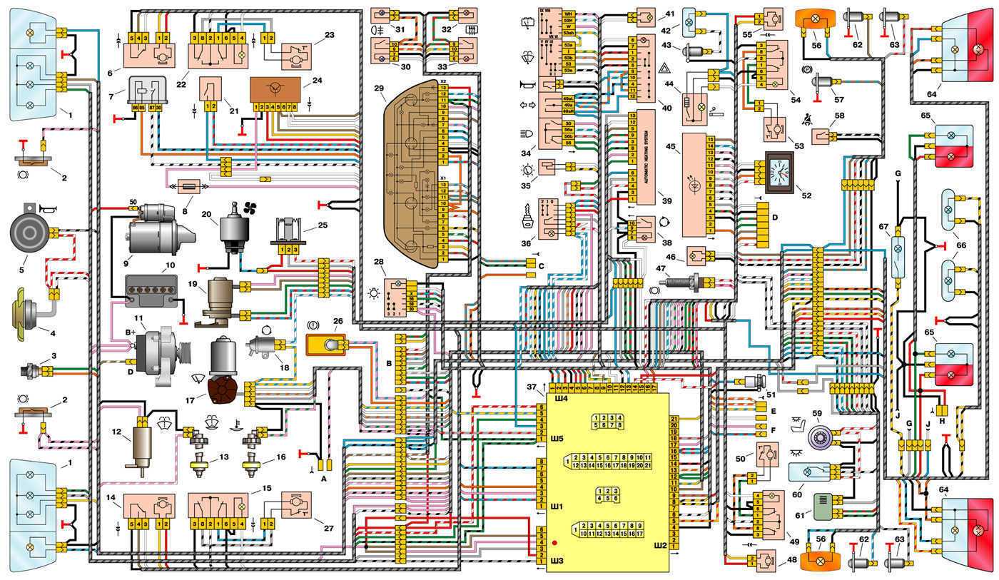 1 – колодка жгута проводов катушек зажигания к жгуту системы зажигания; 2 – колодка жгута системы зажигания к жгуту проводов катушек зажигания; 3 – катушки зажигания; 4 – датчик сигнализатор иммобилизатора; 5 – блок управления иммобилизатора; 6 – свечи зажигания; 7 – форсунки; 8 – колодка диагностики; 9 – колодка жгута системы зажигания к жгуту салонной группы АБС; 10 – контроллер; 11 – электробензонасос; 12 – колодка жгута системы зажигания к жгуту датчика уровня топлива; 13 – колодка жгута датчика уровня топлива к жгуту системы зажигания; 14 – колодка жгута системы зажигания к жгуту форсунок; 15 – колодка жгута форсунок к жгуту системы зажигания; 16 – колодка жгута системы зажигания к жгуту боковых дверей; 17 – датчик скорости; 18 – регулятор холостого хода; 19 – датчик положения дроссельной заслонки; 20 – датчик температуры охлаждающей жидкости; 21 – датчик массового расхода воздуха; 22 – датчик контрольной лампы давления масла; 23 – датчик фаз; 24 – датчик кислорода; 25 – датчик положения коленчатого вала; 26 — датчик детонации; 27 – электромагнитный клапан продувки адсорбера; 28 – датчик уровня масла; 29 – датчик указателя температуры охлаждающей жидкости; 30 – колодка жгута системы зажигания к жгуту панели приборов; 31 – колодка жгута панели приборов к жгуту системы зажигания; 32 – реле зажигания; 33 – предохранитель реле зажигания; 34 – предохранитель цепи питания электробензонасоса; 35 – реле электробензонасоса; 36 – реле электровентилятора; 37 – предохранитель цепи питания контроллера; 38 – колодка жгута системы зажигания к соединителю кондиционера; 39 – комбинация приборов; 40 – выключатель зажигания; 41 – электровентилятор системы охлаждения; 42 – блок бортовой системы контроля; 43 – реле стартера; 44 – контакты 8-клеммных колодок жгута панели приборов и жгута переднего; 45 – контакты 21-клеммных колодок жгута панели приборов и жгута заднего; 46 – маршрутный компьютер; 47 – диагностический разъем.