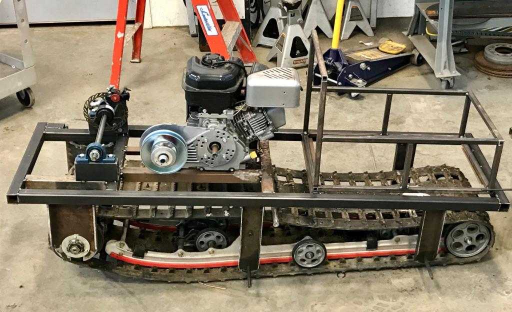 - Гусеницы. Это могут быть гусеницы от трактора, транспортерная лента. Гусеницы можно сделать самостоятельно из V-образных ремней. Для этого ремни пристегиваем к проушинам или колесам. Можно сделать гусеницы из цепей: соединить две одинаковые цепи в два круга, запаять — закрепить звенья и армировать их стальными пластинами на болты. Важна ширина гусеницы, потому как слабому мотору будет сложно тянуть более широкие гусеницы.