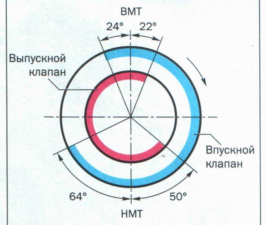 В реальном двигателе, когда поршень находится около своих верхней (ВМТ) и нижней (НМТ) мертвых точек, впускной и выпускной клапаны одновременно открыты