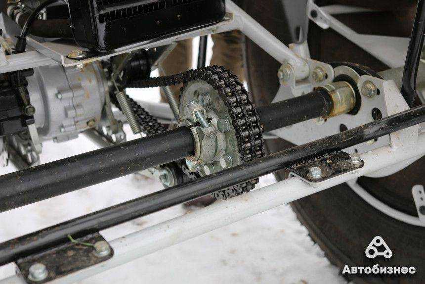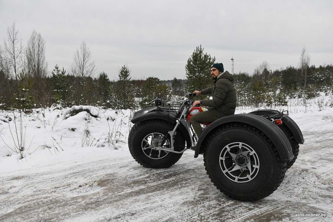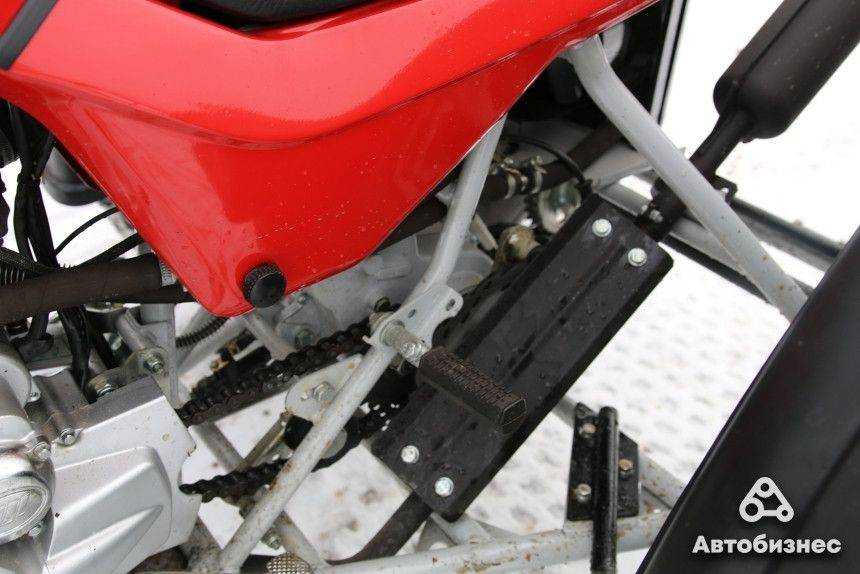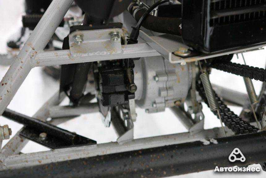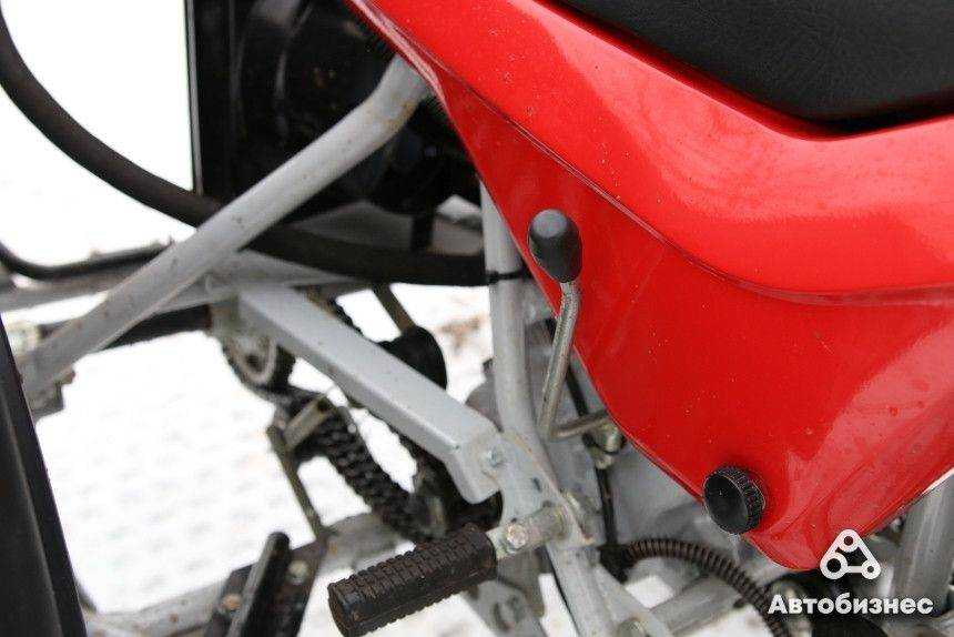 Садимся. От мотоцикла у «Бархана» помимо мотора — руль со всеми соответствующими органами управления, ножное переключение пяти передач, кик- и элекстростартер, краник резерва топлива, цепной привод задних колес, правда, цепь двухрядная. От внедорожного автомобиля — редуктор с понижающей и задней передачами, а также стояночный тормоз.